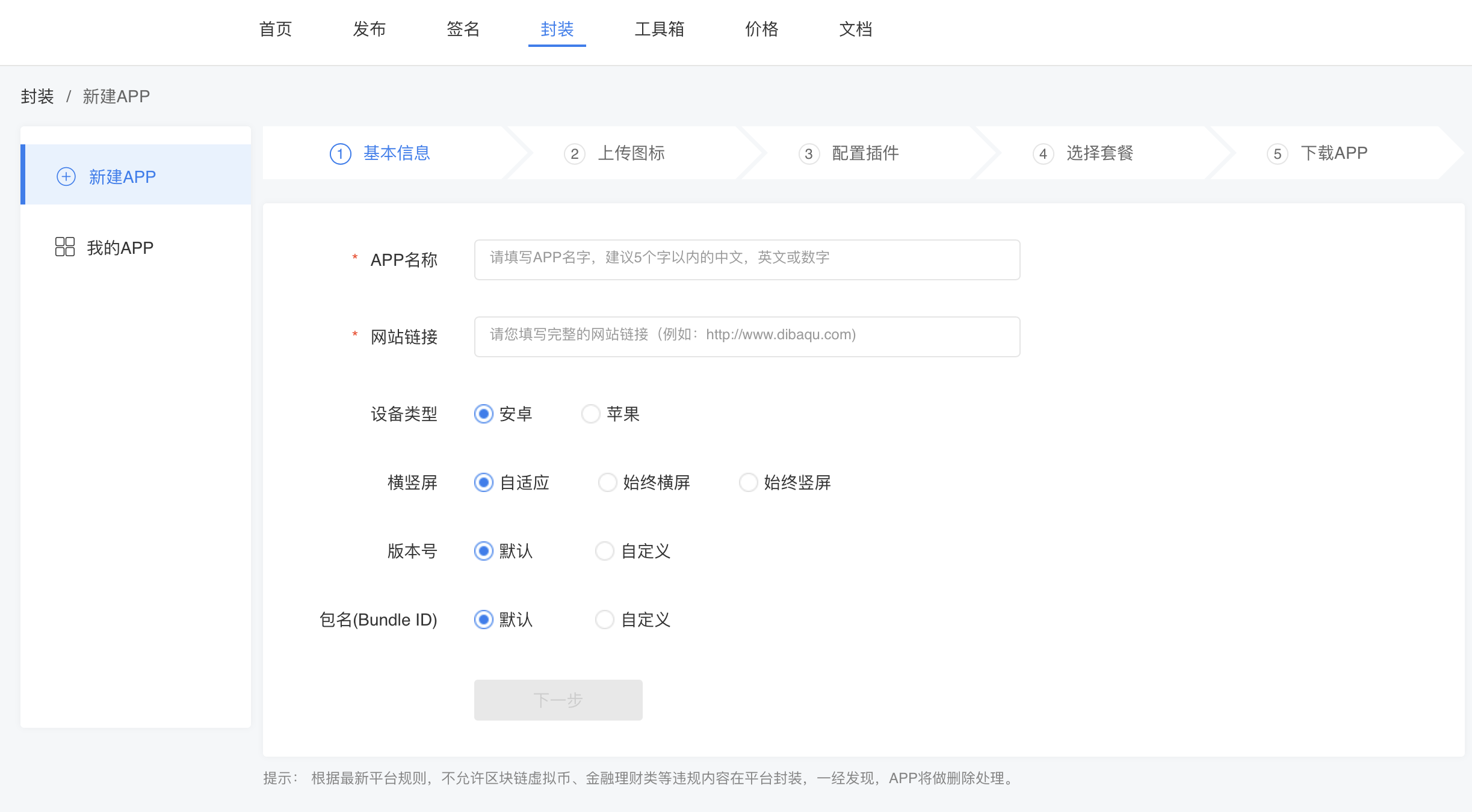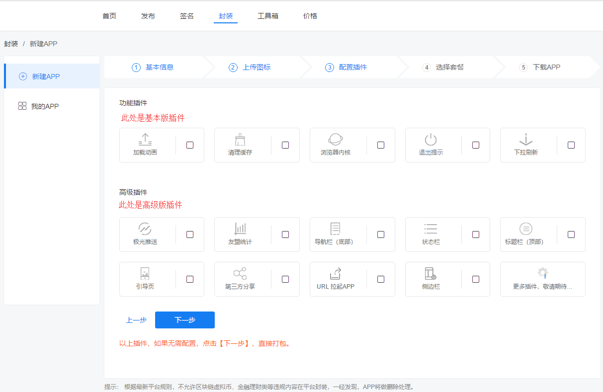 第一步、点击封装按钮,到封装APP首页,红色框为封装APP流程。