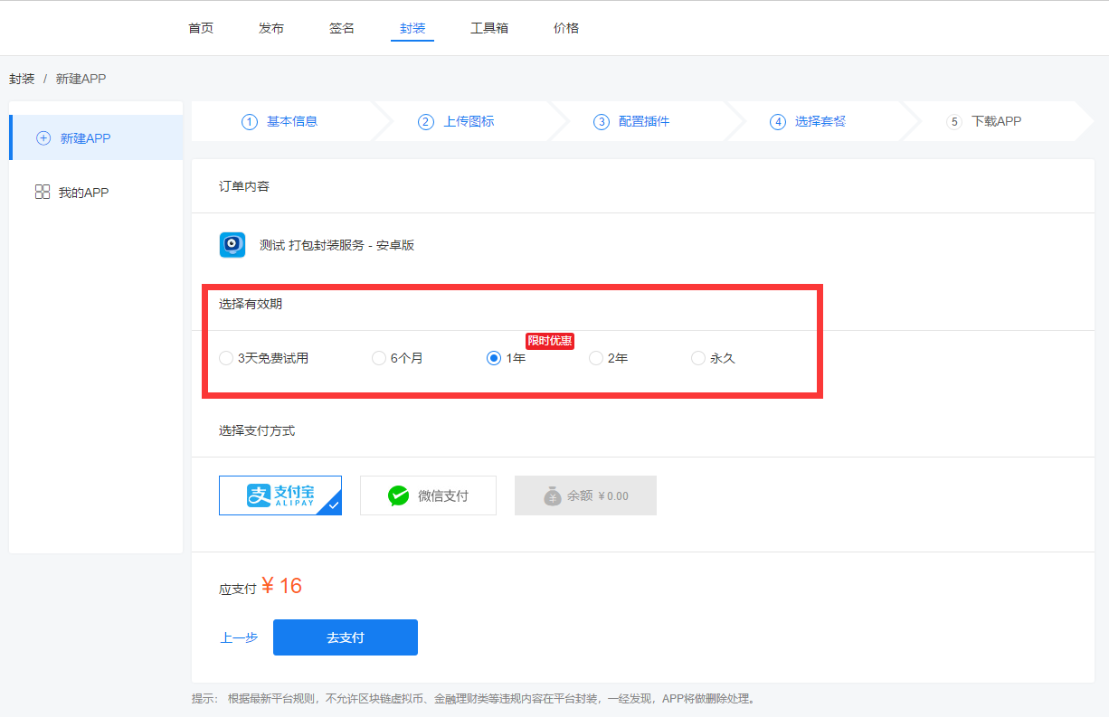 第四步、选择套餐,进行购买
